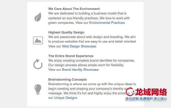 可以通过特殊的设计网站布局,列出我们可以带来的服务内容,而非只是通过文字的形式展示,这样网站访问者可以更容易看到这些信息,例如“熟练使用:Photoshop,PHP,HTML”等。